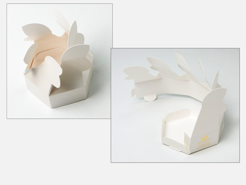 素材や製法へのこだわりが詰まった製品の魅力を最大限に引き立てるパッケージとして、六角形で絞るように蓋を閉じる、特徴的な構造の化粧箱をご提案しました。