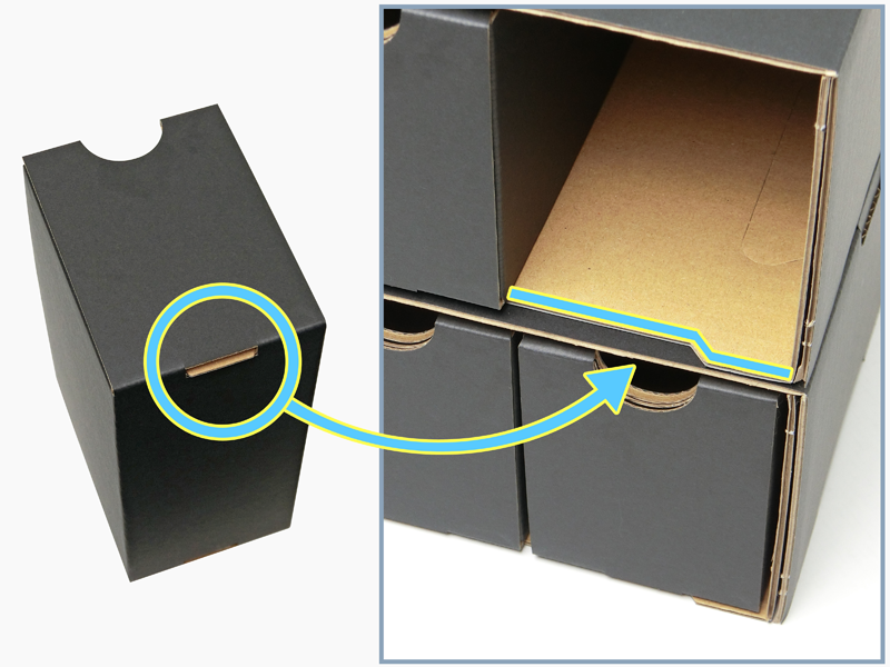 棚部分にあたるケースは1セットに2個入り、引き出し部分は4個入りで、棚の材料厚みは3㎜、引き出しは1.5㎜の段ボール片面黒色シートを採用。どちらも簡単に組み立てるだけで完成します。