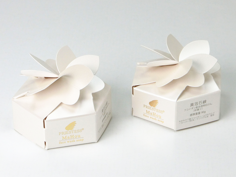 - 花の冠をかぶったようなユニークな形状のパッケージです